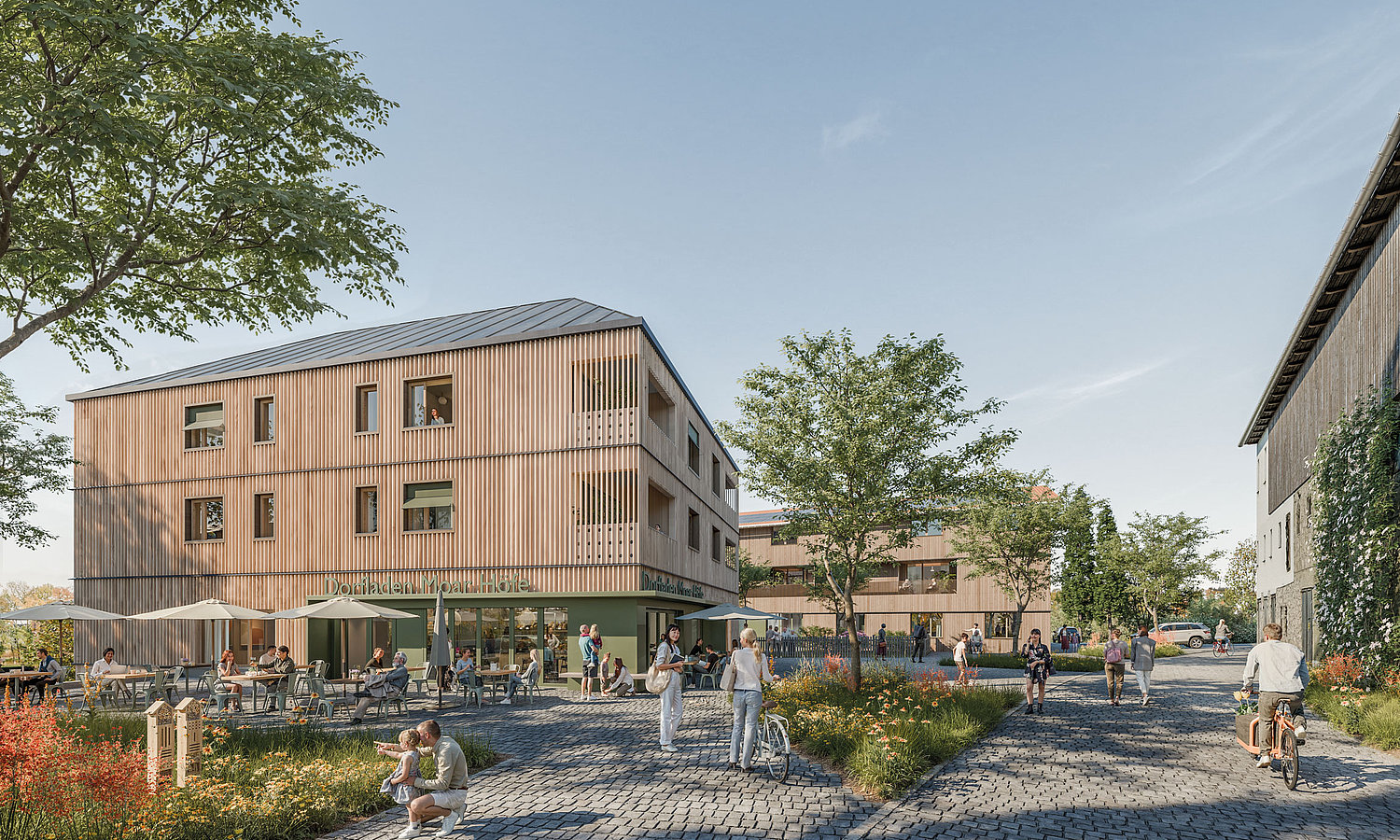 Ein Ort, der alles vereint, was es ein lebendiges Dorf braucht: Wohnraum für Senioren, Familien und Singles, eine umfassende Nahversorgung mit Arzt, Apotheke, Tagespflege und Dorfladen, ein herrlicher Dorfplatz für das Miteinander der Dorfgemeinschaft und vielfältige Treffpunkte im Grünen.