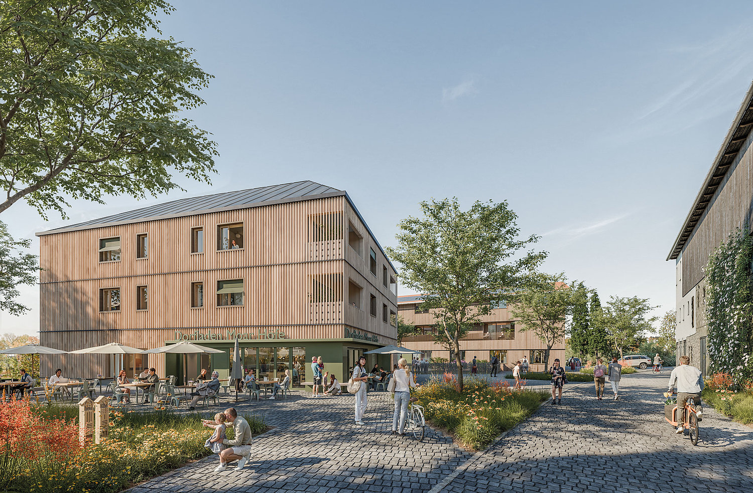 Geplant ist ein lebendiges Quartier im Herzen des Ortes mit Wohnraum für alle Generationen, vielfältigen Angeboten im Bereich der Nahversorgung sowie einem neuen Dorfplatz als Treffpunkt für die Gemeinschaft.